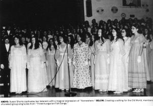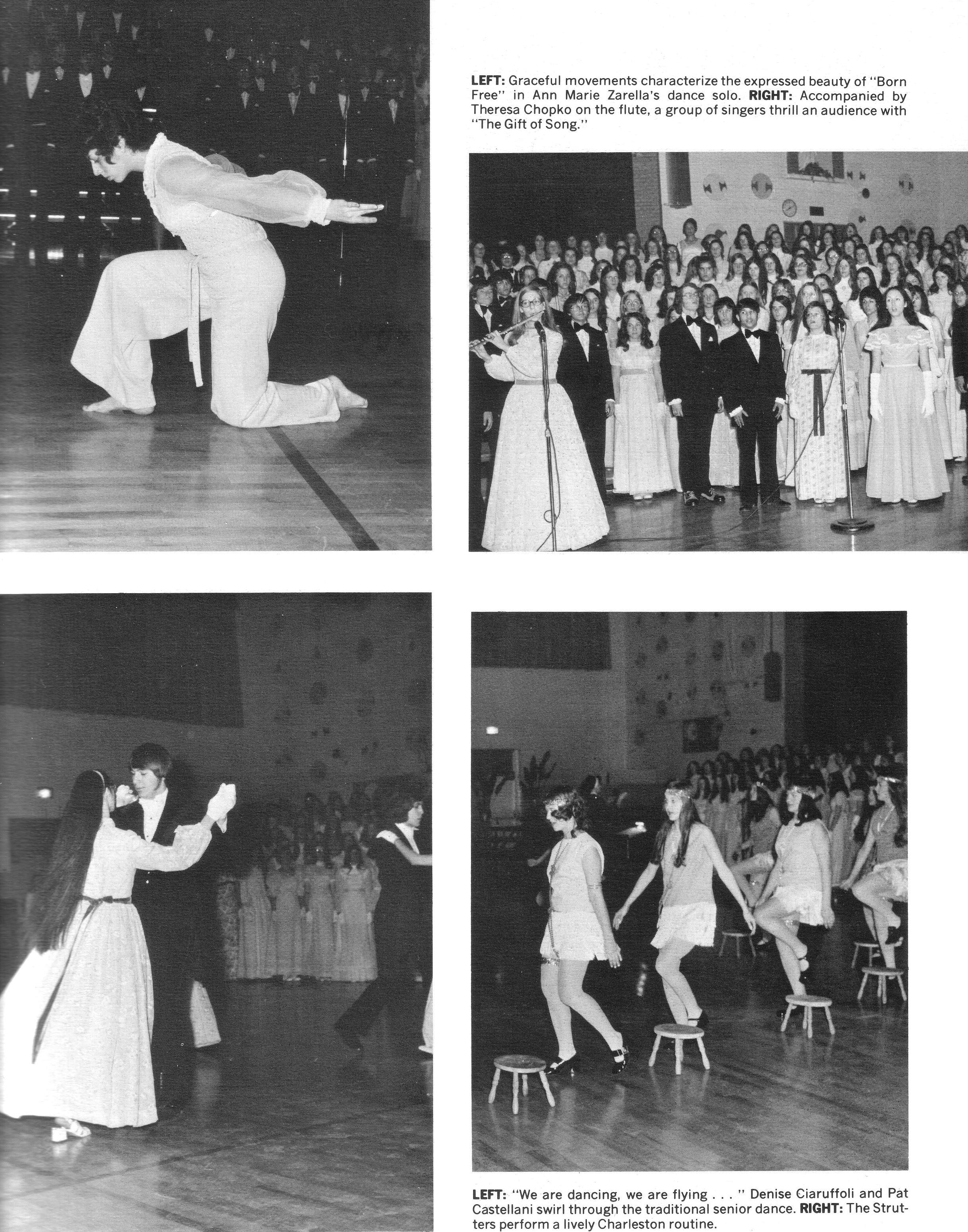 The 1973 spring concert highlighted individual talent both in solo and group performance. “The Gift of Song” featured a lovely melody accompanied by the beautiful strains of a flute played by Theresa Chopko. An all-female group provided a lovely rendition of “Three Hungarian Folk Songs,” and at the intermission the audience was treated to selections from “No, No, Nanette.” The strutters performed a snappy Charleston routine to “Thoroughly Modern Millie.” The final number, “Anthem for Spring,” featured a special ballet group.