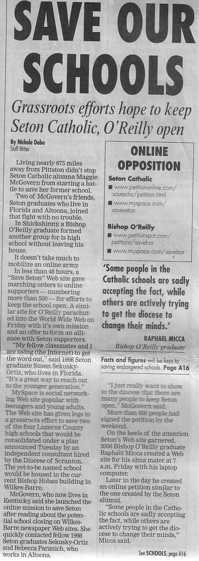 In 2006, the Diocese of Scranton hired Meitler Consultants to conduct a study of the diocesan Catholic school system. In November of 2007, the firm presented a draft proposal for the reconfiguration of diocesan schools. This plan called for the closure of Bishop O’Reilly, along with four other high schools in Luzerne County, in order to create one new merged high school at the Bishop Hoban campus in Wilkes-Barre. Nearly 500 concerned Bishop O’Reilly parents, alumni, and friends soon met to draft a counter proposal that offered a feasible, financially sound alternative to closing O’Reilly. The group’s sincerity, determination, and manner were a testament to the strong O’Reilly tradition and values. Unfortunately, after hours of hard work, the Bishop Joseph F. Martino and the Meitler firm wholly rejected all counter-proposals. Bishop O’Reilly closed it’s doors in June of 2007 and has since been converted into a regional elementary school, Good Shepherd Academy. Most underclassmen transferred to the new Holy Redeemer High School in Wilkes-Barre.